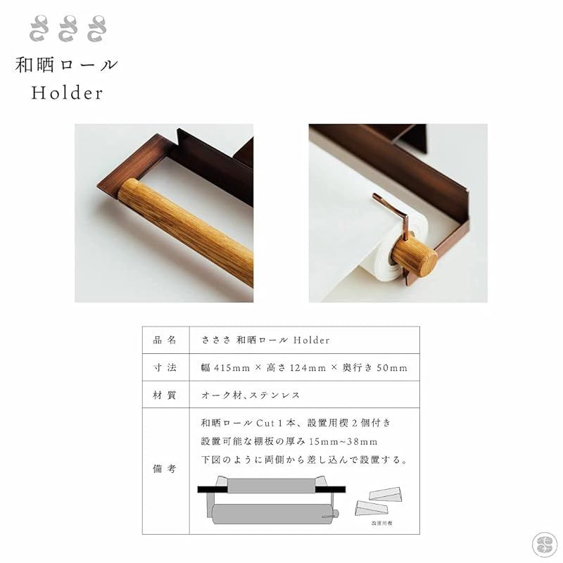 寸法幅415mm × 高さ124mm × 奥行き50mm 材質オーク材、ステンレス 生産国日本 備考和晒ロールCut1本、設置用楔2個付き 設置可能な棚板の厚み15mm~38mm 取り付け方法はイラストを参照ください。 ご注意留め具のブロンズメッキ加工が一部剥がれていたり 青く光ってしまっている場合がありますが使用には問題ございません。 設置用楔にササクレや凹凸、キズが見られる場合がございます。 さささ和晒ロール以外の商品はご使用しないでください。 食洗機や水洗いはおやめください。 火気の近くで使用しないでください。 乾燥により反りやヒビが生じることがございます。