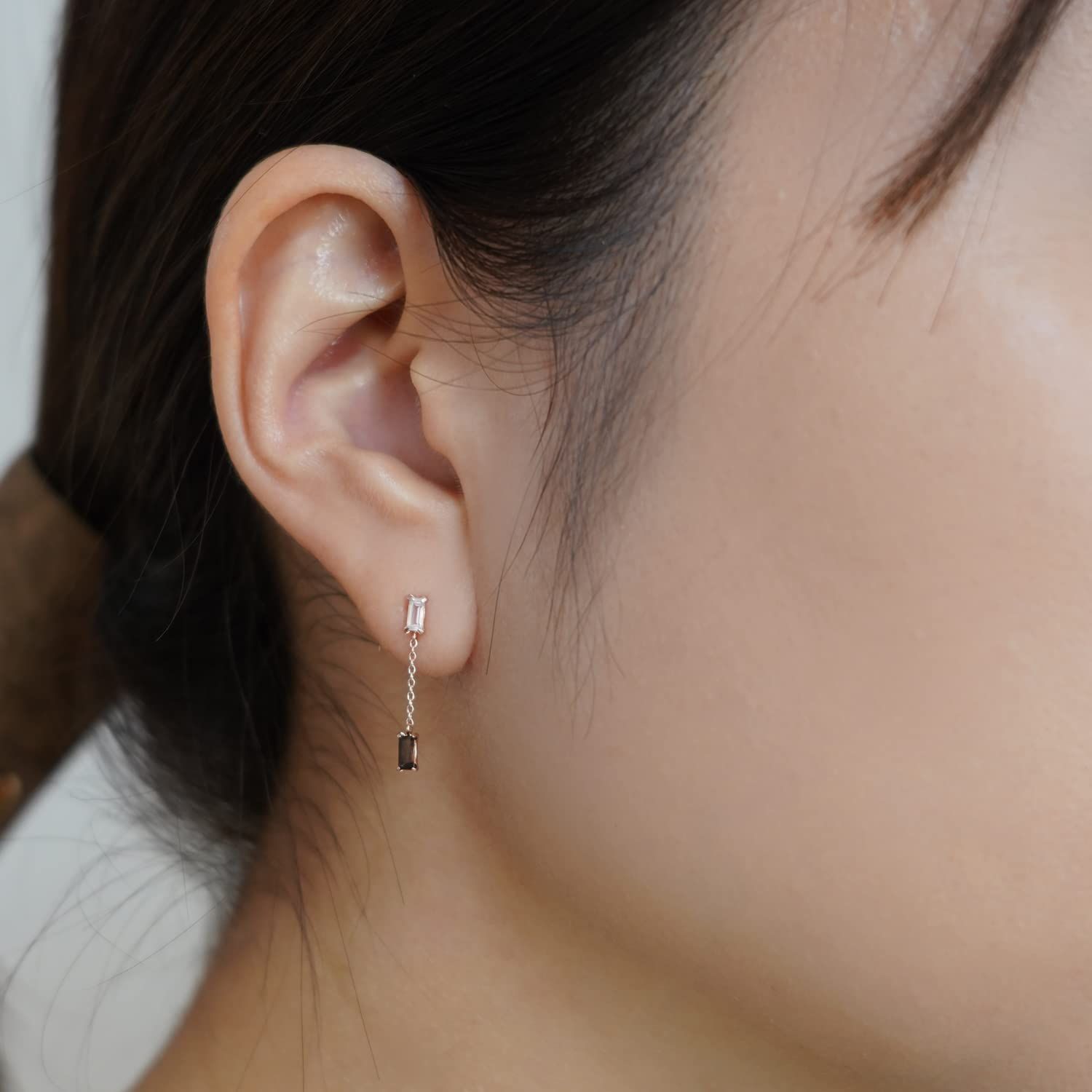 スクウェアカットが斬新なカラーストーン。甘く輝くローズクォーツと落ち着いたスモーキークォーツのコントラストがスタイリッシュに耳元を演出します。日本人の肌の色に合う柔らかな色合いのピンクゴールド。上品で洗練されたデザインに天然石の輝きが加わったネックレスは、ご自分へのご褒美ジュエリーや大切な人へのギフトにぴったりです。