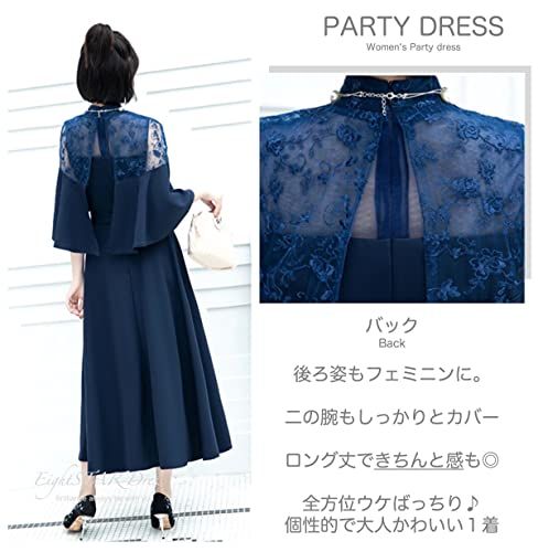 EightSTAR Dress 結婚式ドレス Aライン パーティードレス 二次会 お呼ばれ ロング ミモレ ハイネック レース ワンピース 大人 20代 30代 40代 体型カバー 袖あり JP アルファベット M ネイビー