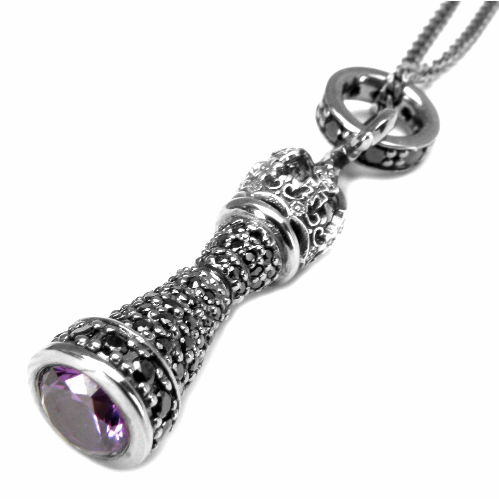 Majestic in scale and detail, the Chess King Pendant commands attention. Inspired by the king piece, its weighty silhouette is intricately carved and set with stones for a presence that feels both authoritative and refined. A deep black coating lends chic, shadowed depth, while the body is pavé-set with countless black zirconia—each movement releasing a fine, controlled shimmer. The openwork crown at the top speaks of sovereignty, and a lab-grown alexandrite mounted at the base shifts mysteriously from pink to purple as the light changes. Even the bail is stone-set, completing a design that reads like a small work of art. Hand-finished in our trusted workshop from forming and setting to the final polish, this is a statement on its own—and irresistibly dramatic when paired with the Queen charm.