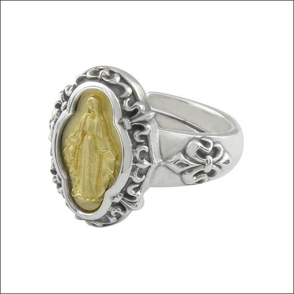 A ring that fuses solemn grace with modern edge. At its center, a brass Madonna radiates an antique aura, framed by a gothic arabesque design that brings an air of timeless storytelling to the hand. Delicate fleur-de-lis motifs on each side symbolize elegance and devotion, while the deep brilliance of sterling silver contrasts beautifully with the warm, subdued gold tone of brass—an interplay of light and shadow that commands quiet yet undeniable presence.