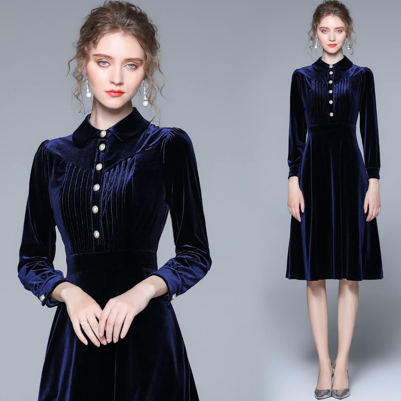 [EightSTAR Dress] 結婚式 ドレス Aライン ベロア レトロ 二次会 同窓会 お呼ばれ ワンピース レディース きれいめ 長袖 パーティードレス ミモレ丈 ゲスト 服 (M, ネイビー)
