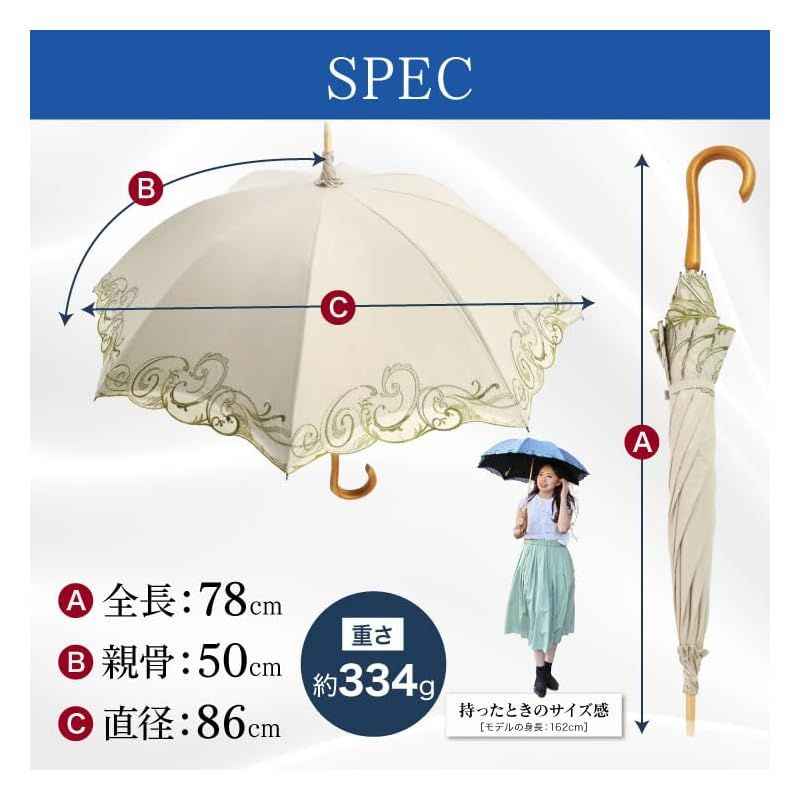 サイズ◆全長:83cm、親骨の長さ50cm・8本骨、開いた時の直径86cm、重さ:約350g