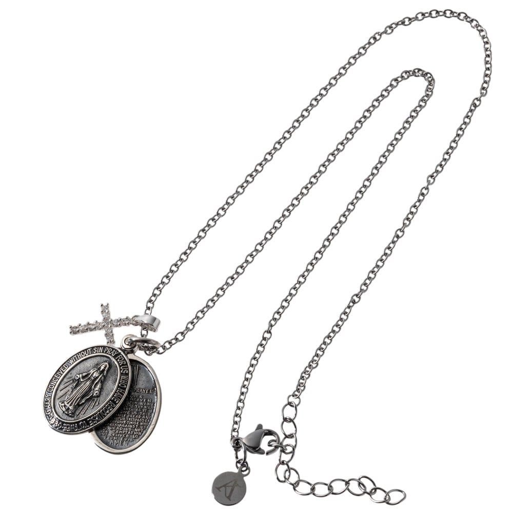 荘厳な美しさとモダンな感性を兼ね備えた、3連の重ね着けペンダント。センターピースは、繊細な彫刻で聖母マリアを描いたメダイ。周囲には「原罪無くして宿り給いし聖マリア、御身に依り頼み奉る我らのために祈り給え」という祈りの言葉が刻まれ、時を越えて受け継がれる信仰と美の象徴を宿しています。共に寄り添うクロスモチーフは、透明感あるジルコニアを敷き詰め、光を受けて煌めきを放ち、静謐さの中に気品ある華やぎを添えます。裏面には精緻なレリーフを施し、どの角度からも完成された造形美を堪能できる仕立て。SV925の重厚な質感とステンレスチェーンの軽やかさが調和し、日常から特別なシーンまで幅広く活躍します。提携アトリエ工房の熟練職人が一点一点丹念に仕立てることで、単なるアクセサリーを超えた芸術的な完成度を実現。纏う人の胸元で、祈りと美意識を静かに語り続ける逸品です。
