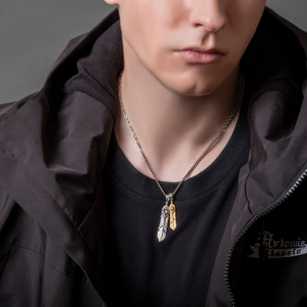 立体的な重なりが奥行きを生む、二枚重ねのフェザーペンダント。羽根の稜線から中骨まで丹念に彫り起こし、メインには澄んだ天然ブルートパーズ、相棒にはクリアCZを配して胸元に清冽な光を宿します。小さなフェザーはゴールドコーティング。シルバーとのコントラストがレイヤードの陰影を際立たせ、上質な存在感に。左右を入れ替えたり、片方だけで着けても表情を自在にアレンジ可能。背面には鳳凰マークとブランド刻印・ホールマークを刻み、細部まで品格ある仕立てです。チェーンは喜平・アズキ・オーバル&サークルの3種をミックスした凝ったワーク。全長50cm(45–50cmに調節可)で単体でも重ねてもバランス良好。日常から特別な夜まで、洗練を添えるユニセックスなセット。