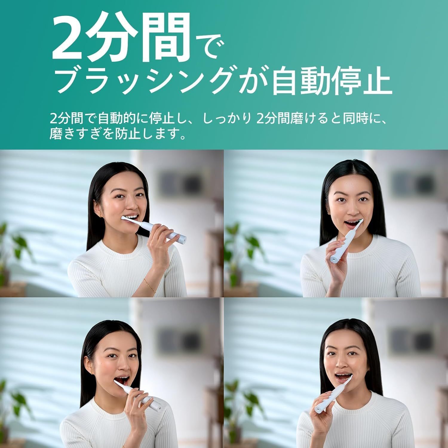 スマートタイマー機能(ブラッシング自動停止機能)により2分間で自動的に停止し、しっかり 2分間磨けると同時に、磨きすぎを防止