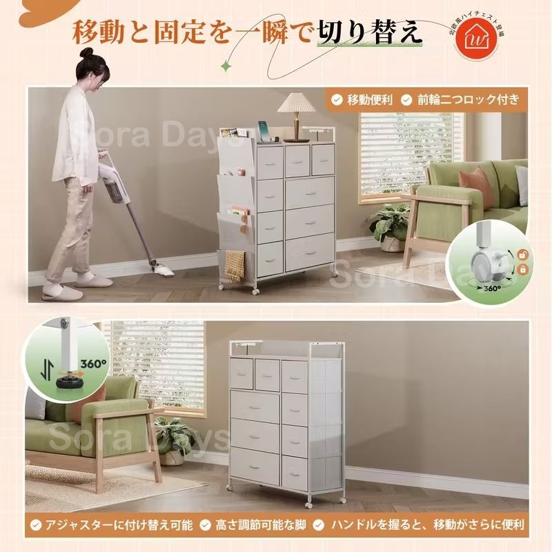 チェスト キャビネット タンス モノトーン キャスター付き シンプル おしゃれ インテリア 北欧 衣類収納 大容量 省スペース 引き出し 4段9杯 サイドポケット 2口コンセント USBボード付き ブラック ホワイト ×101 cm