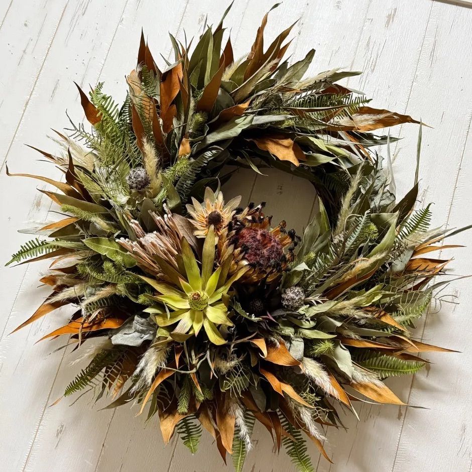 人気のプロテア等 大きめのワイルドフラワーをたっぷり使用したクレセントリース♪