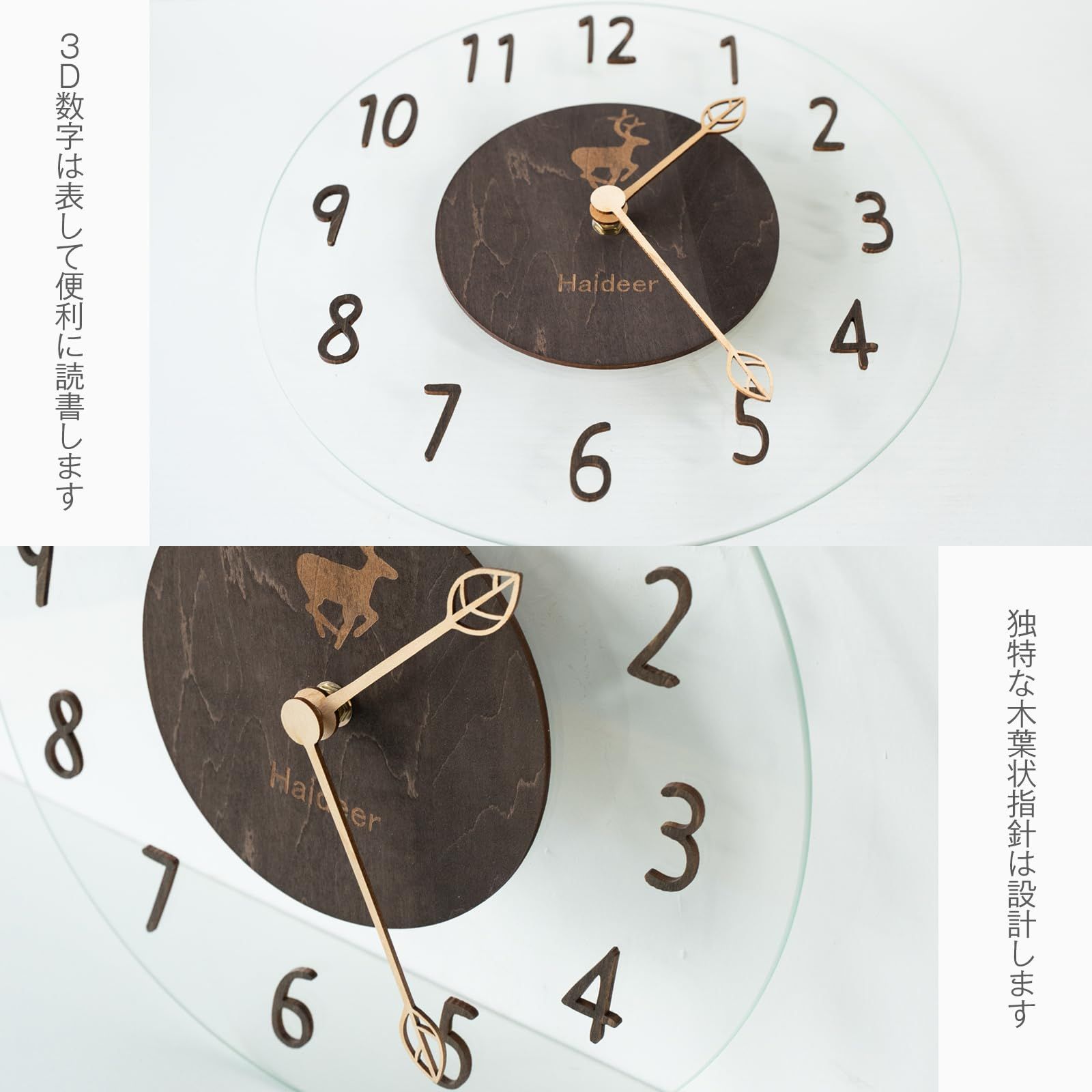 【自然素材】実用性とファッション性を兼ね備えた電波掛け時計です。ブラウンの数字、枝型(葉型)の針、透明な文字盤が特徴です。キッチン、図書館、オフィスなど、どんな場所でも一目で正確な時間を確認できます。シンプルな大きな数字と、時間・分を示す目盛りにより、お子様でも読みやすい設計になっています。