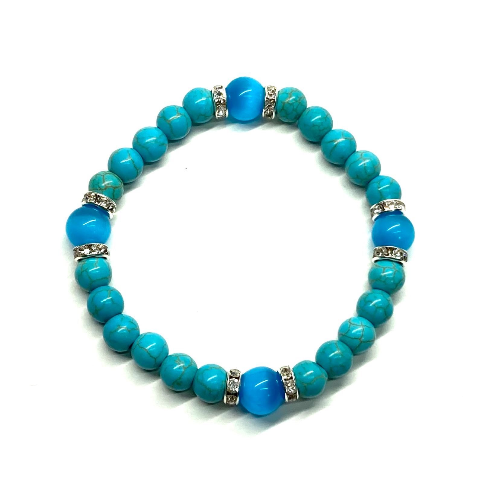 こちらは、8mm玉のキャッツアイとターコイズを使用したパワーストーンブレスレットです。間にはロンデルを挟み高級感ある大人っぽいデザインに仕上がっています。内周約17cmです。気になる方は是非この機会にどうぞ。