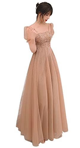 [EightSTAR Dress] パーティードレス イブニングドレス 半袖 ピアノ 発表会 ドレス ロング 大人 二次会 花嫁 主役 新婦 チュール マキシ Aライン スレンダーライン (S, ベージュ)