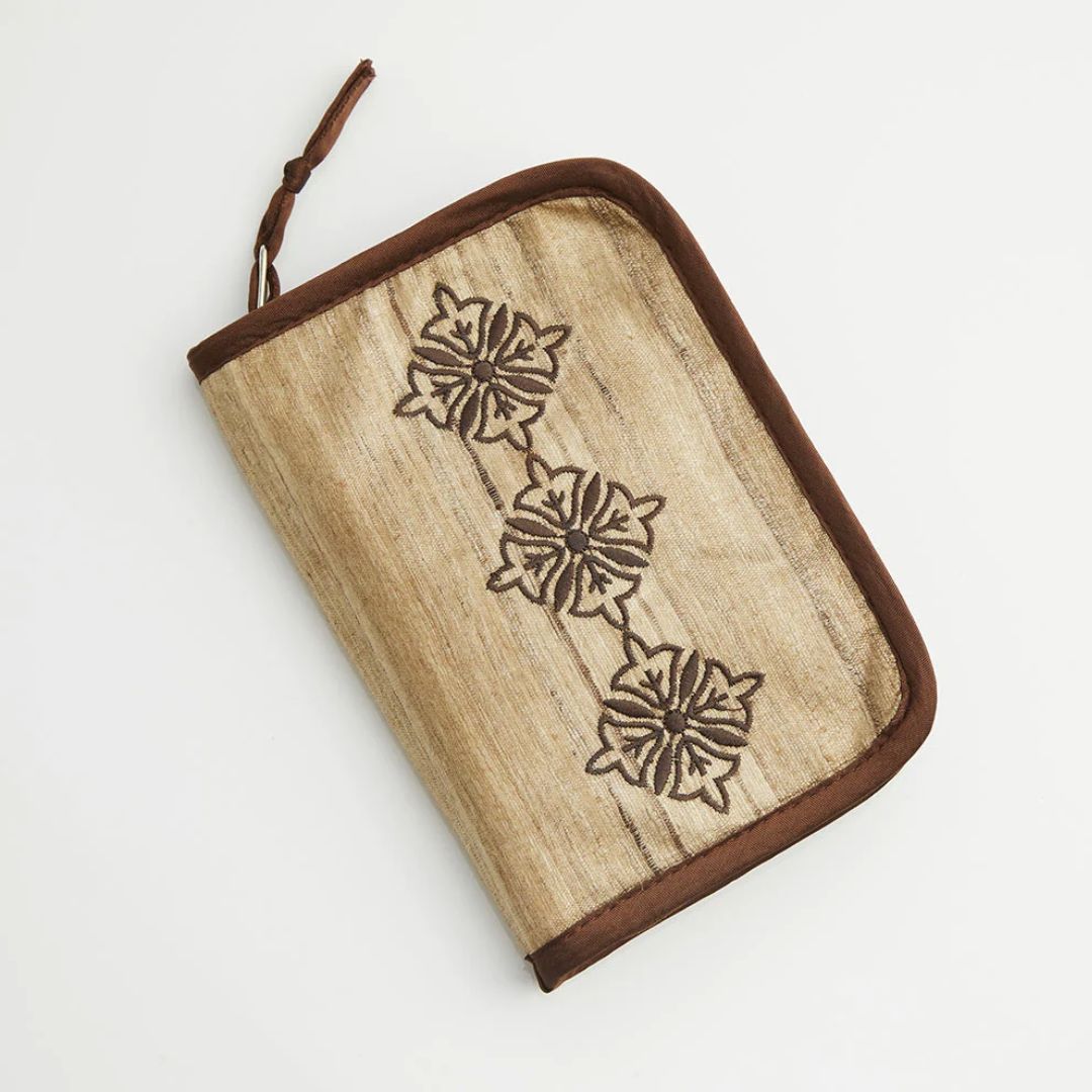 ケースは熟練の職人さんにより、インドのカディシルクで丁寧に作られています。可愛らしいお花モチーフの刺繍が施されています。内部は、針先とコードを収納できるスペースとなっており柔らかな触り心地です。開けたときに落ちてしまわないようカバーがついた設計となっており使いやすく見た目もシンプルで落ち着いています。