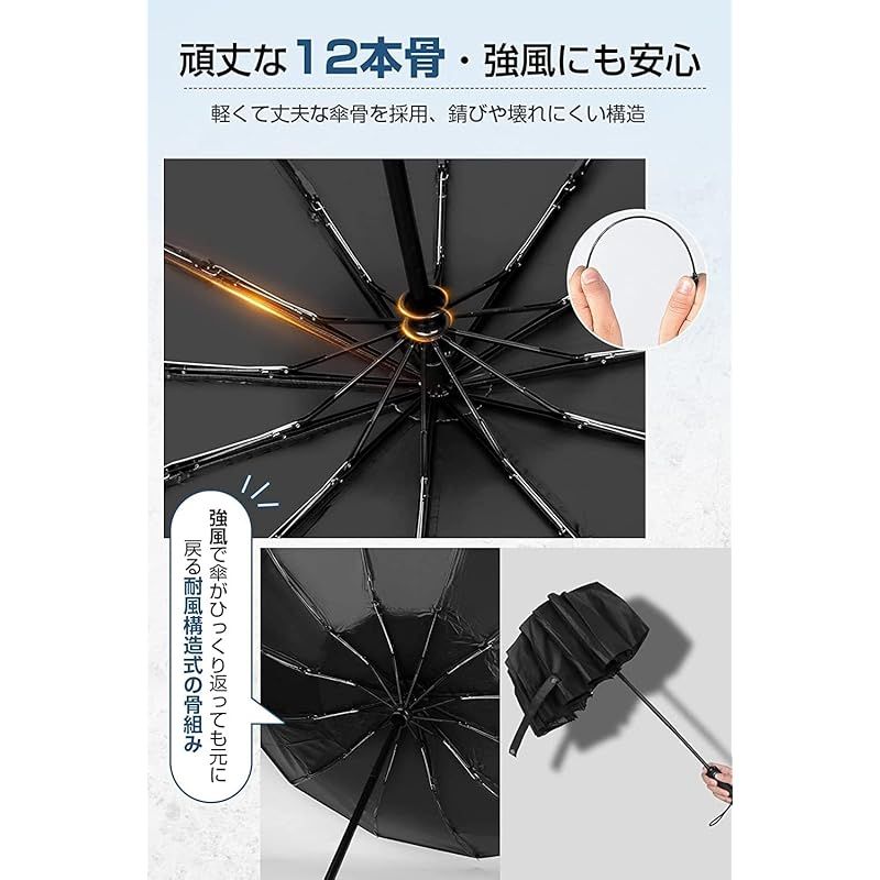 【強靭な12本骨耐強風設計】柔軟性と強度を兼ね備えた12本骨を採用し、風に対する耐性と耐久性が向上しています。さらに、錆びにくい防食加工が施された傘のフレームは非常に頑丈で、強風や激しい雨にも耐えられ、折れたり曲がったりしにくい設計です。万が一強風でひっくり返ってしまっても風の力を受け流し、傘を閉じるだけで簡単に元に戻ります。風が強い日でも心強い耐風傘です。