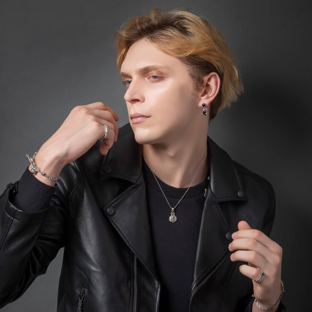 耳元に小さな劇場をつくる、二連ドロップのスタッドピアス。上部に深みのあるCZブラック、下部にスモーキークォーツを配し、王冠風の石座と粒装飾、繊細な唐草が光を受けて陰影豊かにきらめきます。チェーンでつないだドロップが輝きながら軽やかに揺れ、上質な気配をまとわせます。台座や爪の一つひとつまで丁寧に仕上げ、裏面にはトレサリーの意匠と〈925〉、ブランドサインを端正に刻印しました。素材はSV925。鏡面の艶と燻しが宝石の色を引き立て、モードにもクラシックにも溶け込む洗練の一本です。単体はもちろん、クラウンモチーフのジュエリーとのレイヤードもおすすめ。ユニセックスでお使いいただけます。※1個(片耳分)での販売です。