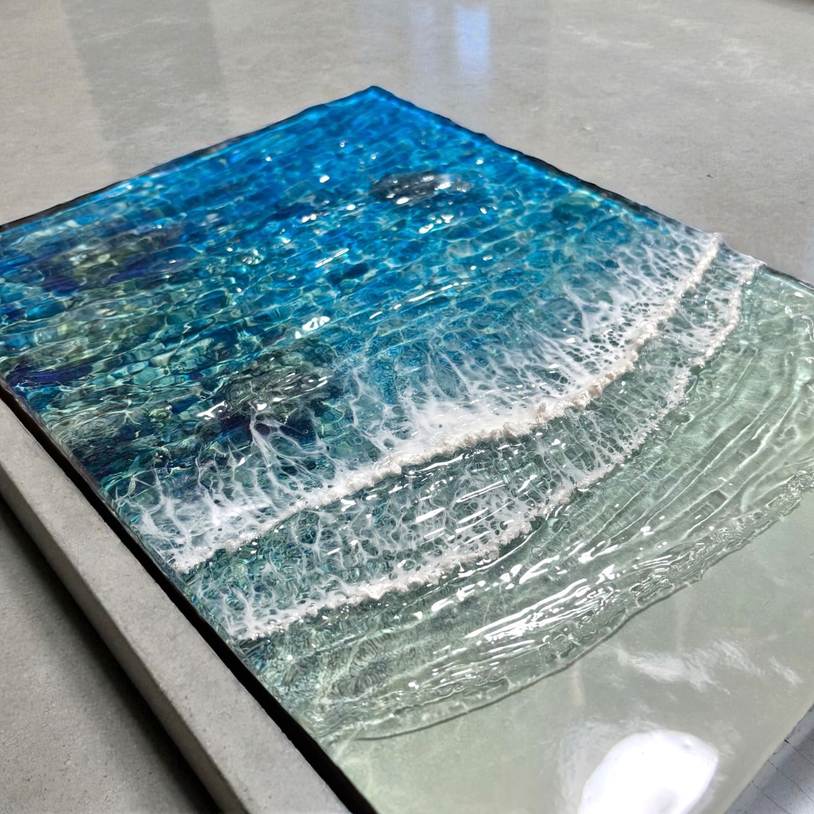 レジンで水面のゆらめきを表現し光の当たり方や見る角度によって海の表情が変わります。またレジンを混ぜ込み気泡も入れ水感を表現しています。