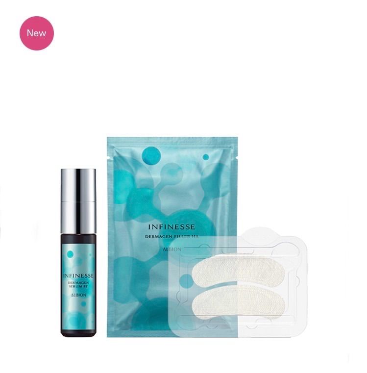 化粧水の後、「ダーマジェン フィラー HA」を目元や口元などの気になる部分に貼り「ダーマジェン セラム BT」をマスクの上からなじませるようにお使いください。