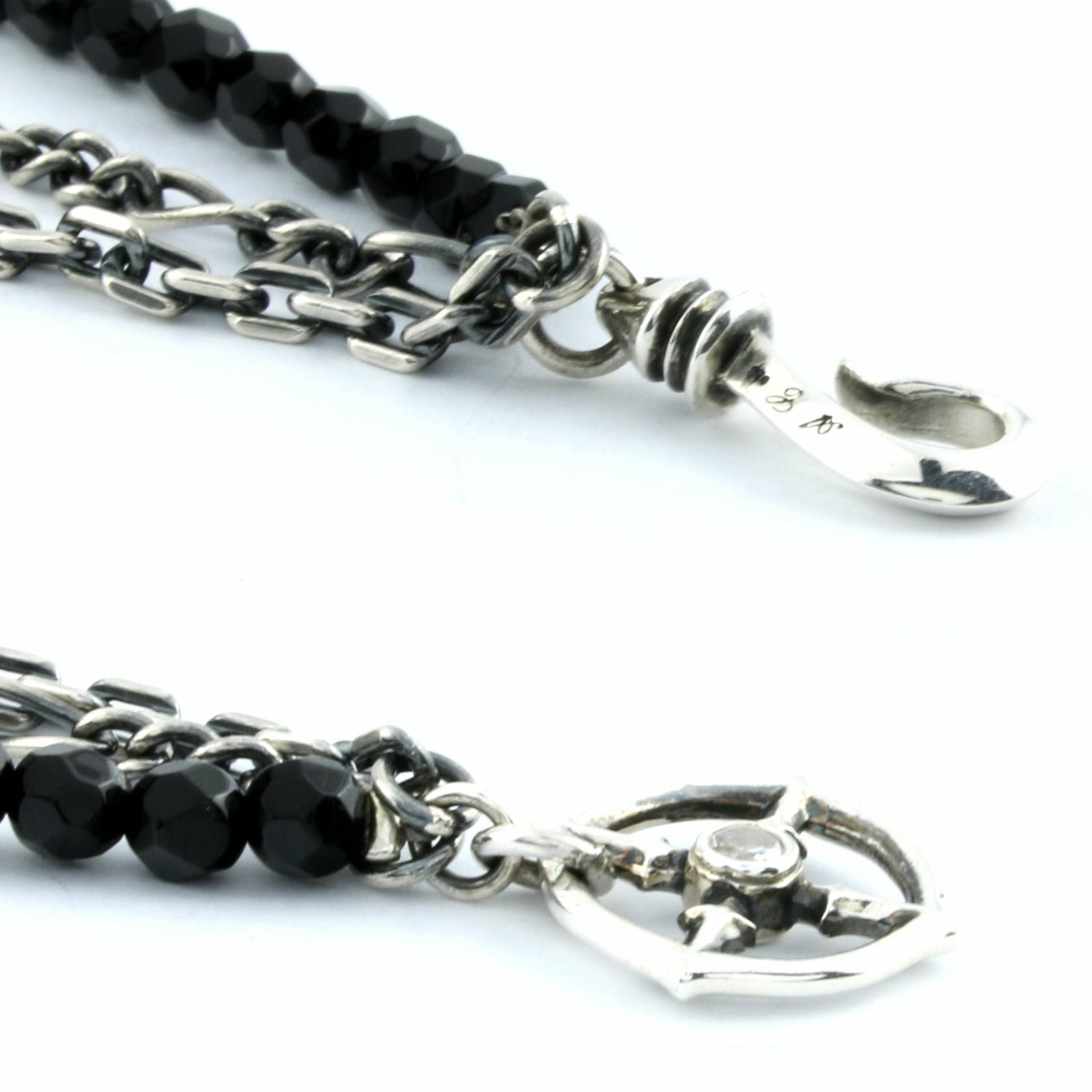 漆黒の輝きとメタルの重厚感が交錯する〈トリプルレイヤード・ブレスレット〉。カットを施したブラックスピネルが放つ鋭い光沢に、アズキチェーンと喜平チェーンの異なる質感を重ねることで、立体的でリズミカルな表情を生み出しています。手首を一周する3連の構築的なデザインは、シンプルでありながら存在感を放ち、モードに馴染む万能さを備えます。留め具にはホイールモチーフを採用し、中央にあしらわれたクリアジルコニアが凛とした煌めきを添え、細部にまでブランドの美学を息づかせています。精緻なチェーンワークと天然石の組み合わせは、信頼あるアトリエで熟練職人が一点ずつ手掛けたもの。日常の装いに加えるだけで洗練を引き上げ、ジュエリーを超えてアートオブジェのような気品を漂わせます。強さと美しさを同時に纏う、現代的ラグジュアリーの象徴といえる逸品です。