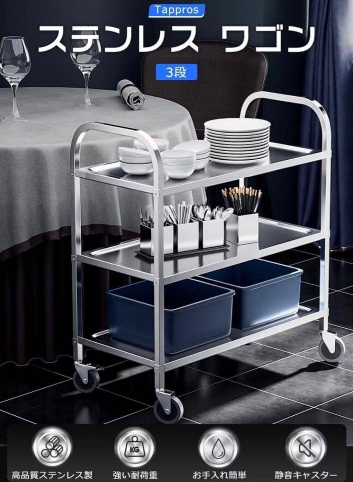 【材質▪サイズ】サイズ:幅85×奥行き45×高さ90cm。ワゴンの素材は高品質のステンレス製で、頑丈で錆びにくいです。高い標準研磨技術、先進、光沢が美しい、優れた荷重、長持ち、耐摩耗、防錆、耐腐食、使用寿命が長い、強度が高い、丈夫です。