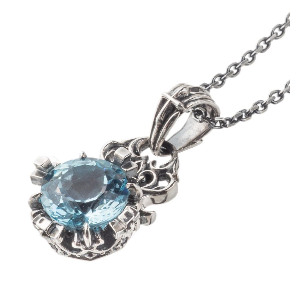澄んだ空を閉じ込めたような、気品あるブルー。〈クラウン ラウンド・ブルートパーズ ペンダント〉は、王冠を模した石座にブルートパーズを抱え、側面には繊細な装飾石を散りばめた凝った造りが魅力です。バチカンとトップの間に流れる透かし唐草が光を招き、表情に立体感をプラス。程よいサイズで肌にすっと馴染み、Tシャツにもジャケットにも上品に映えます。素材はSV925。鏡面の艶と燻しの陰影が宝石の水面のような輝きを引き立てます。背面にはブランドサインと〈925〉の品質刻印を端正に刻印。仕立てはアトリエで一点ずつ成形・研磨を重ね、エッジの丸みや高さまで丁寧に調整しました。11月の誕生石が胸元に清らかな青を添える、日常を格上げする“身につけるアート”。ペンダントトップのみのご用意(チェーンは別売り)です。