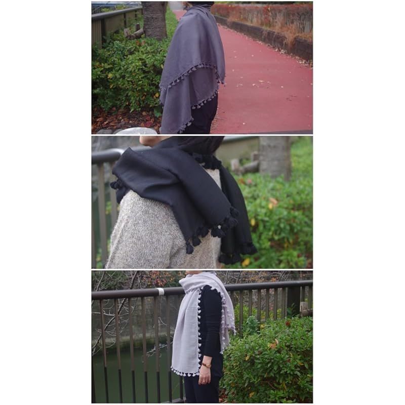 今回のシルクウールは、若干の透け感がありそれ程の厚みはありません。幅が約72センチで長さが約185センチの大判にポンポンが付いています。ポンポンが丁寧な手仕事で付けられています。 色に関しては、今回、秋冬のポンポンショールは初めてのオリジナルの為、鉄板色の5色を選びました。