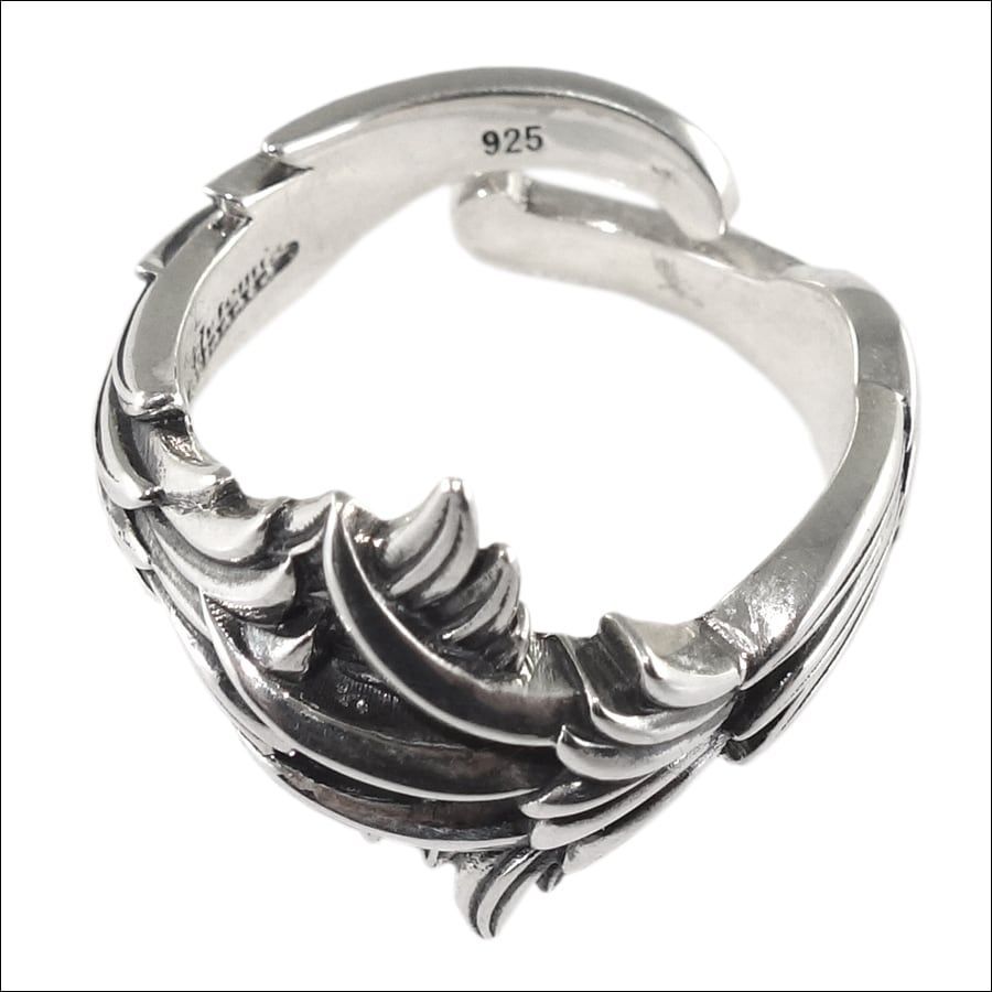 天使の翼が息づくように重なり合う、躍動感あふれるウイングリング。翼とクローのラインを大胆に交差させ、前衛的なシルエットに。羽根一枚一枚の稜線まで精緻に彫り起こし、鏡面と燻しのコントラストが指先に深い陰影を描きます。飛躍・上昇を象徴するモチーフは、お守りのように日常へ自信と祈りを添える存在。ほどよいボリュームと内側の滑らかな仕立てで着け心地は軽やか、装いのワンポイントとしても主役級です。アトリエが丹念に仕上げた作品です。使うほどに艶を増す、永く愛せる小さなアートピースリング。