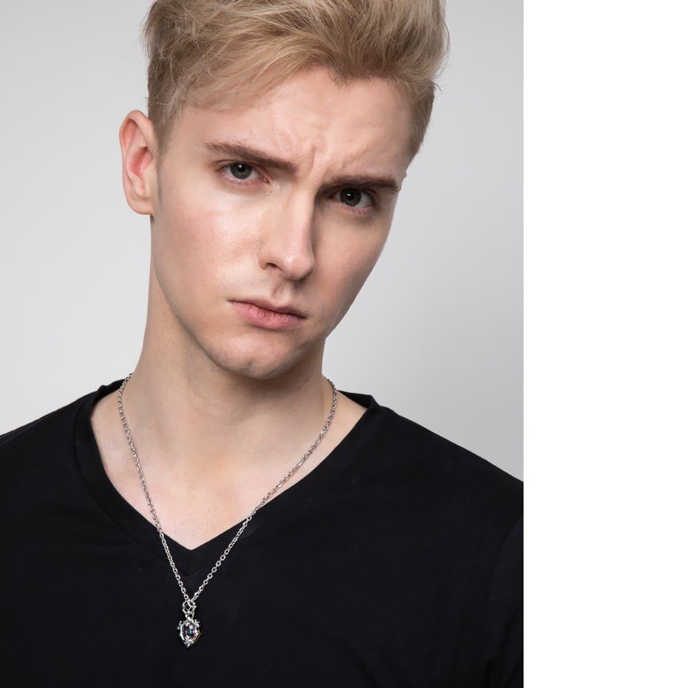 A prism of color held in sculpted silver. A rainbow-hued mystic quartz sits within a shield-shaped frame of oxidized sterling silver, shifting from green to violet as the light moves. The bail forms a fleur-de-lis cross and is set with a black cubic zirconia, its dark gleam tightening the composition and heightening the contrast with silver’s shaded relief. On the reverse, an openwork arabesque gallery admits light to the stone, adding depth without excess. Every edge is cleanly finished and the proportions are engineered to sit neatly at the collar—substantial, yet refined. Crafted under the brand’s direction at a partner atelier with true savoir-faire, it carries a quiet aura from everyday wear to evening.