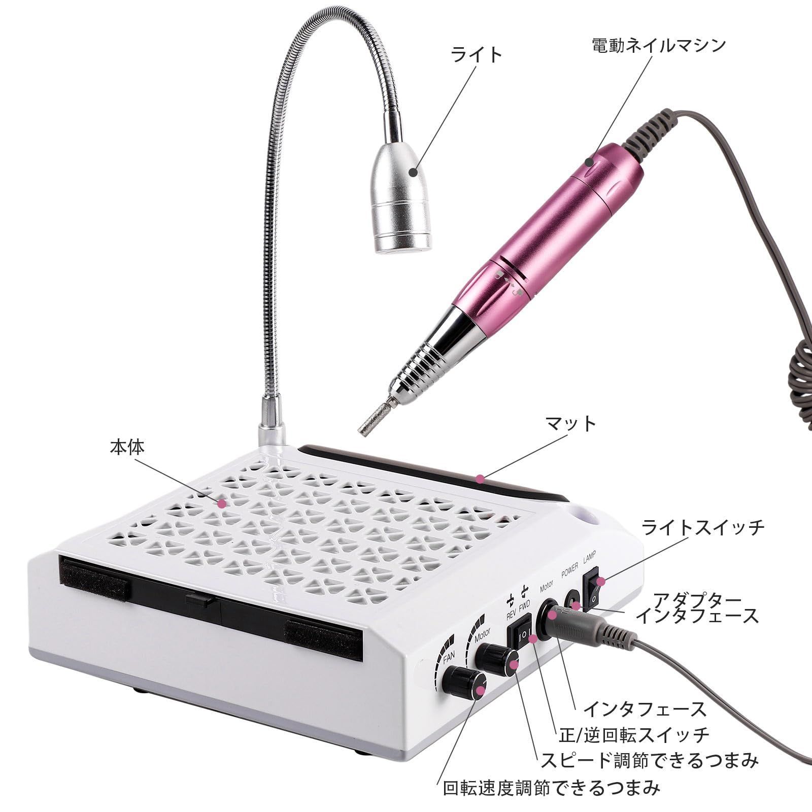 【商品について】セット内容:ネイルダスト集塵機*1、アダプター*1、ライト*1、電動ネイルマシン*1、電動ネイルマシンビット*6、電動ネイルマシンサンディングバンド*20、ダストブラシ*1、爪やすり*1、日本語説明書*1 電圧:100V-240V 出力:80W 音圧レベル:60-75dB 材質:プラスチック