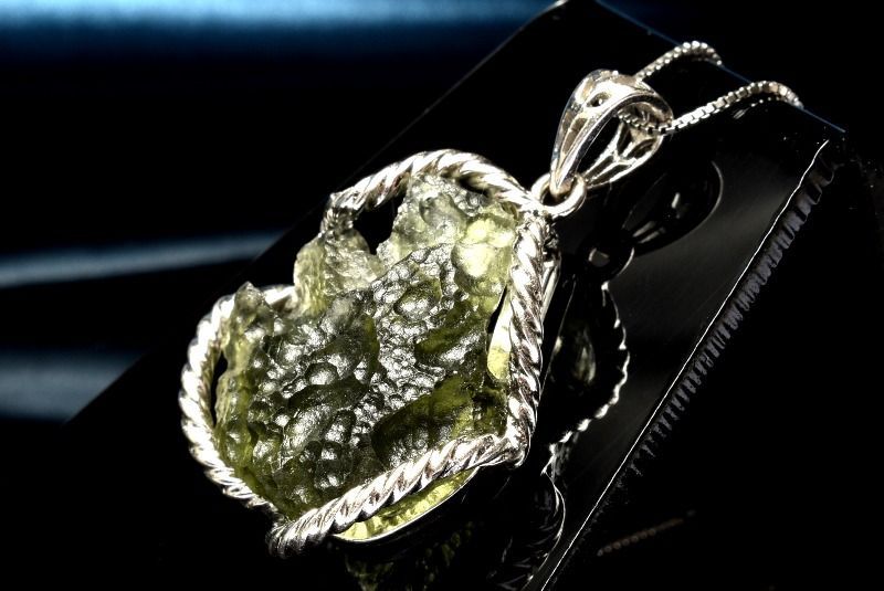 テクタイトは、遥か昔、地球に隕石が衝突した際に、その衝撃で地表の岩石が融解・飛散し、それらが冷やされてガラス質状に固まったものであるとされています。テクタイトは黒色ですが、モルダバイトは緑色、または褐色がかった透明で、ガラス光沢を放っています。