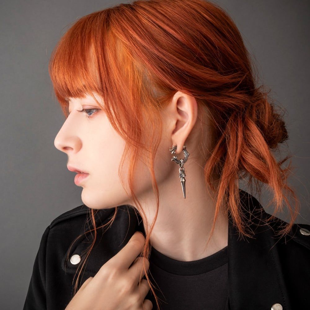 正面にすっと空間が走る、視線を奪うトリッキーなフープピアス。キャッチ側から立ち上がる立体構造は、耳たぶを抱くように回り込み、フルール・ド・リスの優美な曲線で気品を描きます。そこから銀の牙を思わせるスパイクがドロップし、揺れるたびに燻しの陰影と鏡面の艶がコントラストを生み、表情をドラマティックに変化。繊細な彫り込みが光を細やかに拾い上げ、ボリュームは程よく、着け心地は驚くほど快適です。キャッチにはブランドロゴと“925”、さらに三つのホールマークを刻印。確かな品質と美意識を物語ります。ブランドの意匠を精確に再現し、提携アトリエが手業で丹念に制作。一本でコーデの主役に、片側コーデやペア使いでも印象的。エレガンスとエッジを一つに融合した、現代的モダン・クラシック。ギフトにも最適です。