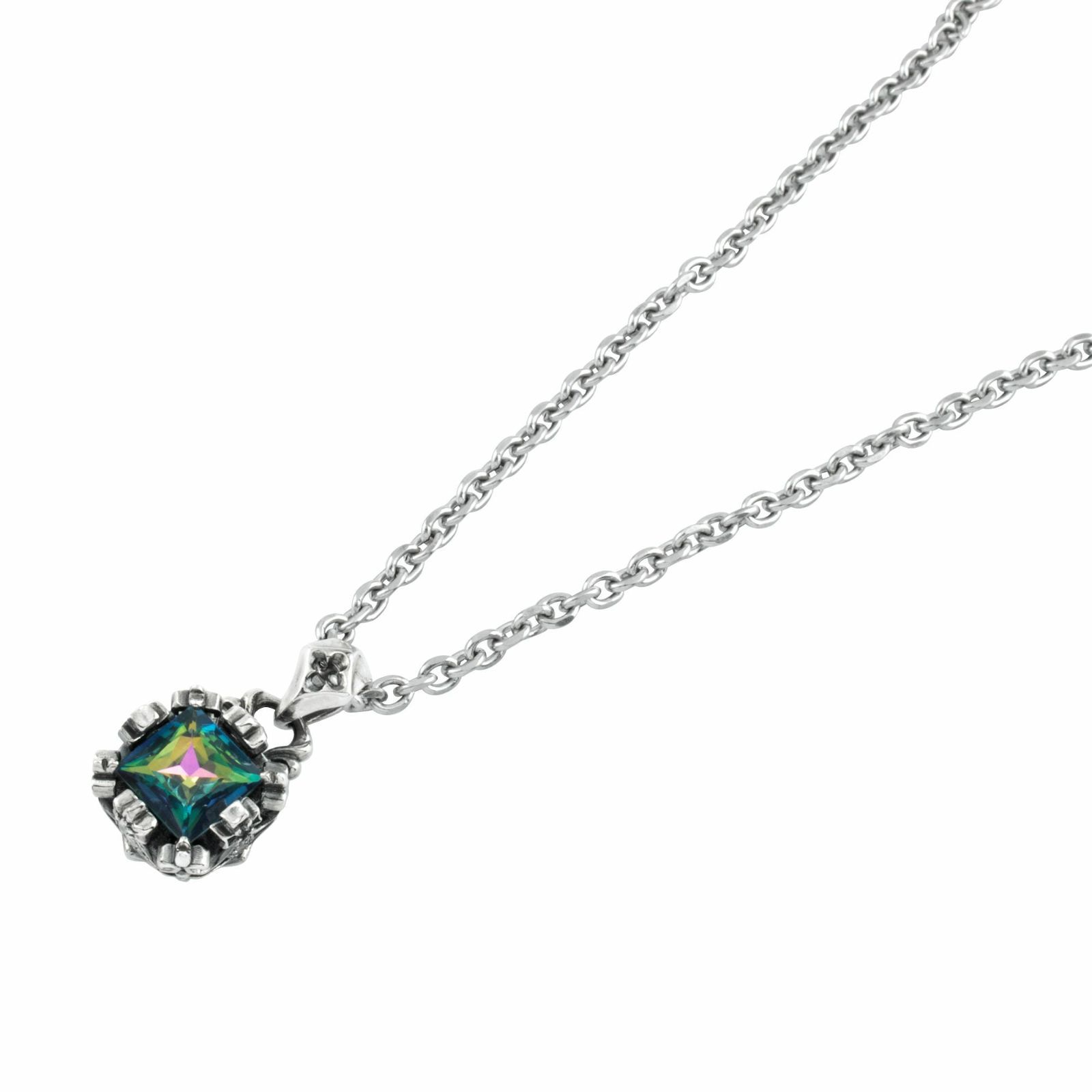 Bring a prism of color to the neckline. This petite pendant centers a square-cut Mystic Topaz whose greens, blues, yellows, and reds shift with every movement, casting a luminous depth across the chest. The stone sits in a crown-inspired square bezel, its prongs and borders finely carved with cross and fleur-de-lis motifs. Polished silver and oxidized shadows play in harmony, giving the piece a refined rhythm and quiet drama.