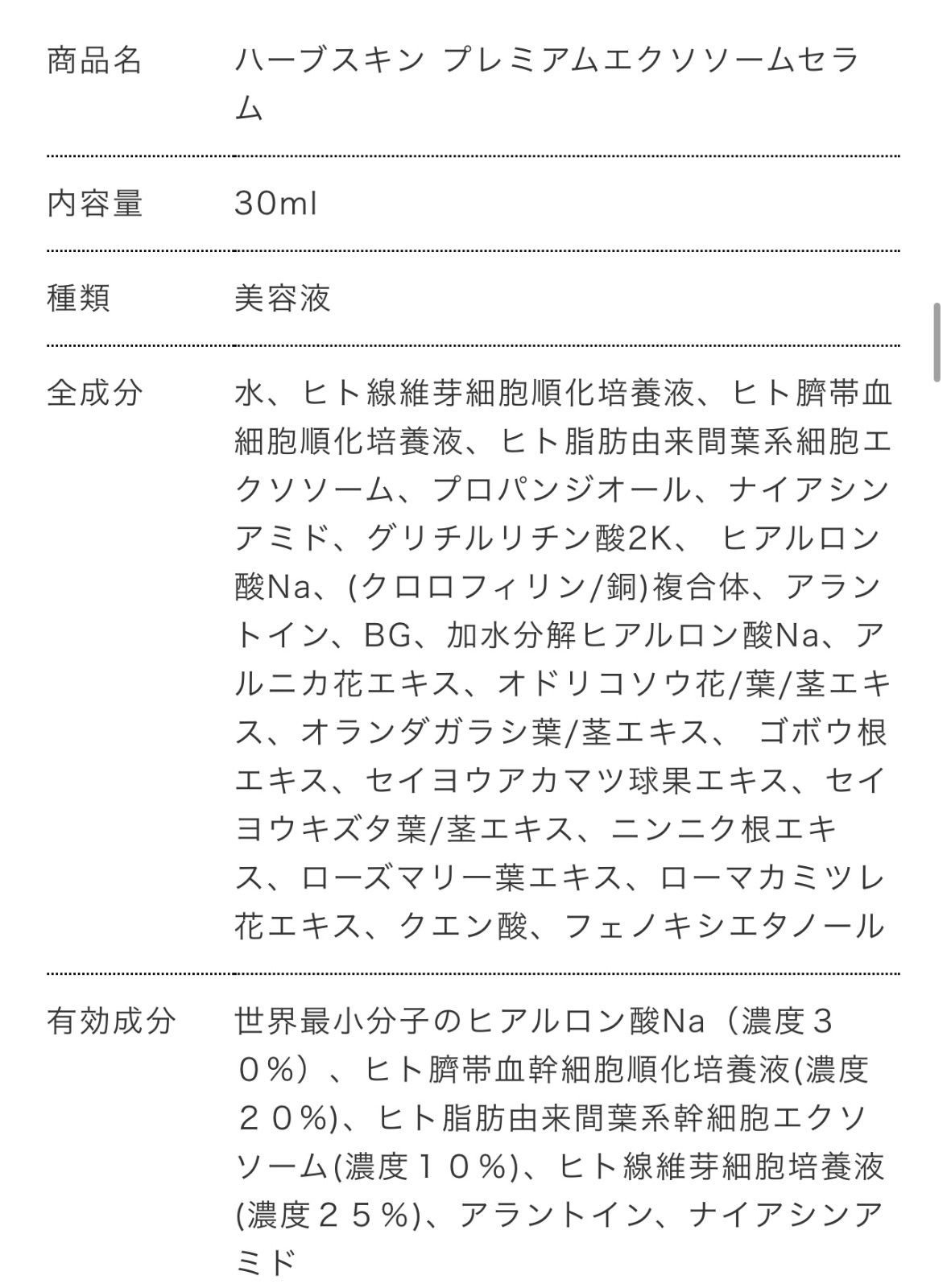 水、ヒト線維芽細胞順化培養液、ヒト臍帯血細胞順化培養液、ヒト脂肪由来間葉系細胞エクソソーム、プロパンジオール、ナイアシンアミド、グリチルリチン酸2K、 ヒアルロン酸Na、(クロロフィリン/銅)複合体、アラントイン、BG、加水分解ヒアルロン酸Na、アルニカ花エキス、オドリコソウ花/葉/茎エキス、オランダガラシ葉/茎エキス、 ゴボウ根エキス、セイヨウアカマツ球果エキス、セイヨウキズタ葉/茎エキス、ニンニク根エキス、ローズマリ一葉エキス、ローマカミツレ花エキス、クエン酸、フェノキシエタノール