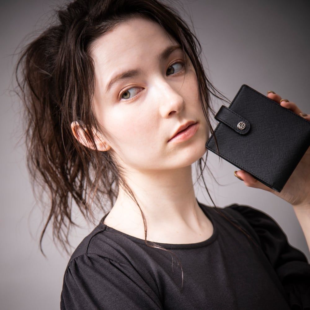 This flap mini wallet is crafted from Saffiano leather, prized for its scratch-hiding cross-hatch and quietly lustrous finish. Up front, a sculptural silver “A” emblem—our signature—adds a poised highlight without overpowering the silhouette. Inside, a clean, intuitive layout keeps essentials perfectly ordered: 5 card slots, 2 bill compartments, and 1 coin pocket. The tight, slim profile slips into any pocket without bulk, suiting both tailoring and off-duty looks.