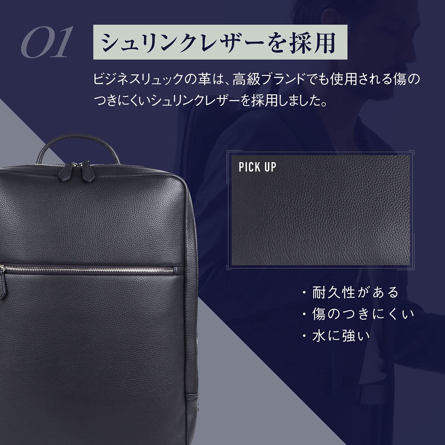 ?【傷のつきにくいシュリンクレザーを採用】ビジネスリュックの革は、高級ブランドでも使用される傷のつきにくいシュリンクレザーを採用しました。耐久性があり傷のつきにくい革ですので毎日使う仕事用や普段使いにぴったりです。ツヤ感のある高級な牛本革を使用しており、ビジネスシーンからフォーマル、デートまでシーンを選ばずにご使用いただけます。末永くご愛用頂けます。