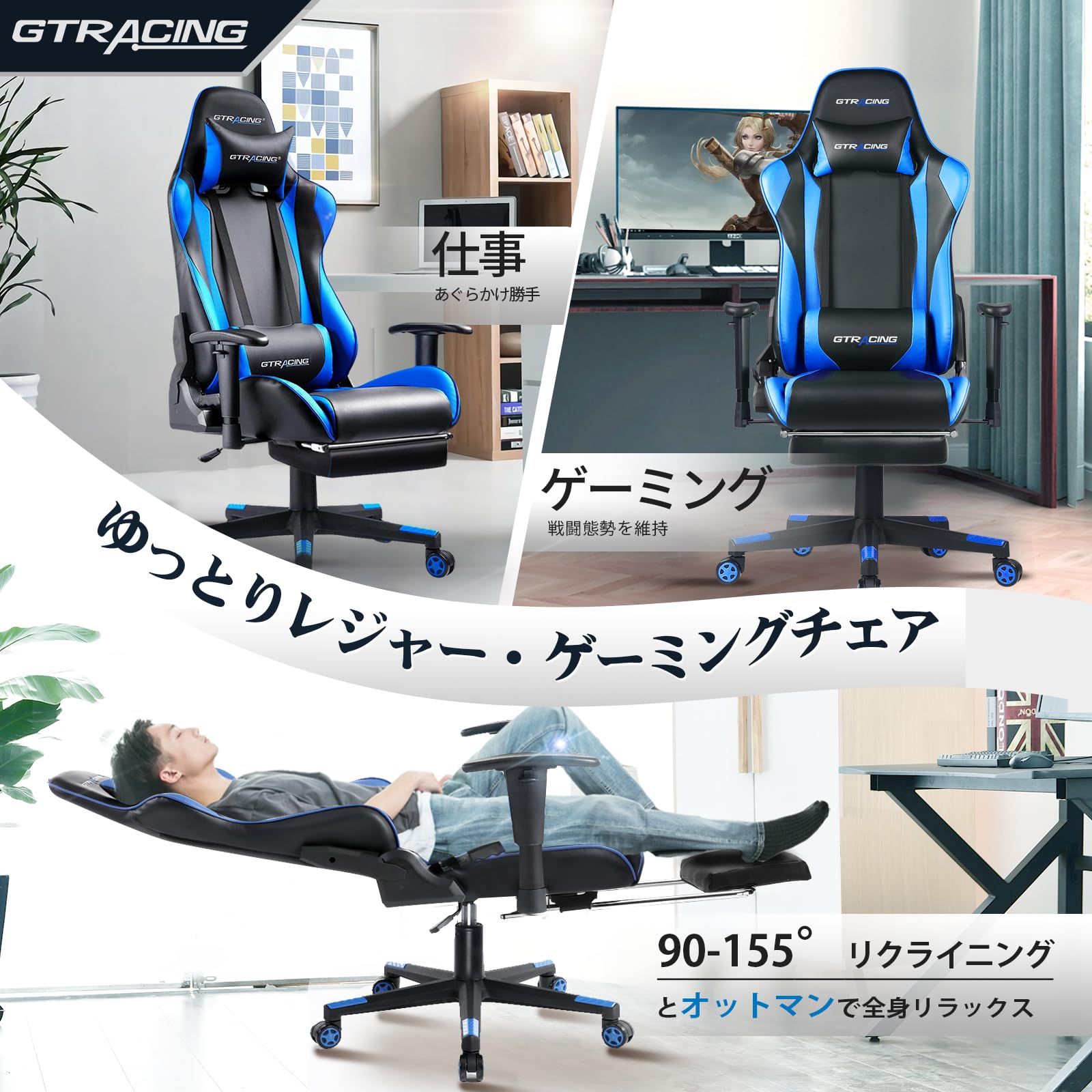 GTRacing ゲーミングチェア オフィスチェア デスクチェア ゲーム用チェア リクライニング パソコンチェア ハイバック ヘッドレスト ランバーサポート ひじ掛け付き 高さ調整機能 PUレザー オットマン付き ブルー (GT002F-BLUE)