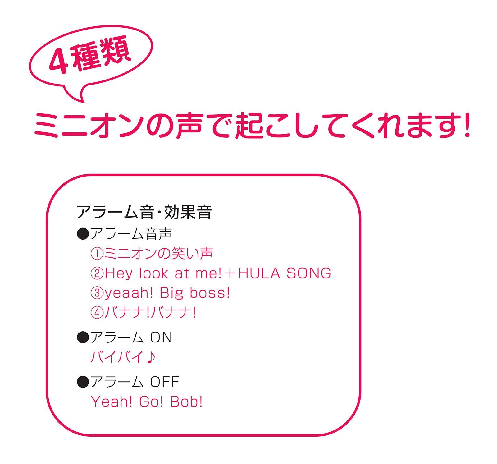 アラーム: 1ミニオンの笑声 2Hey look at me! + HULA SONG 3yeaah! Big boss! 4バナナ!バナナ!
