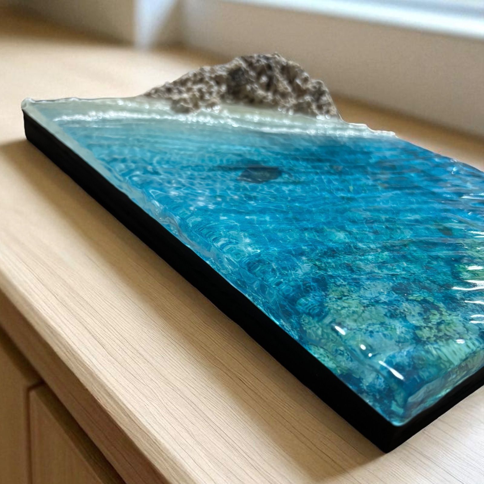 レジンで水面のゆらめきを表現し光の当たり方や見る角度によって海の表情が変わります。またレジンを混ぜ込み気泡も入れ水感を表現しています。