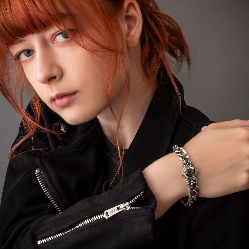 存在感あるSV925製の喜平チェーンブレスレット。鏡面に磨き上げたリンクは、交互に唐草を刻んだ意匠でリズミカルに連なり、燻しの陰影が造形を奥行き深く引き立てます。脱着はクロスモチーフを抱いたナスカン式。所作までもエレガントに演出。視線を射抜くIDプレートには、センターに澄んだ黒の奥行きを湛えるクリアブラック・ミスティッククォーツ、両脇にCZブラックを端整にセッティング。モノトーンの煌めきが装いを凛と締めます。ブランド監修を受け、提携アトリエが緻密に完成させた一作です。背面にはブランドロゴと“925”に加え、三つのホールマーク刻印と〈Black Night〉の銘を刻印。単体でも、同シリーズとのレイヤードでも絵になる、長く愛せるモダン・アートピースです。
