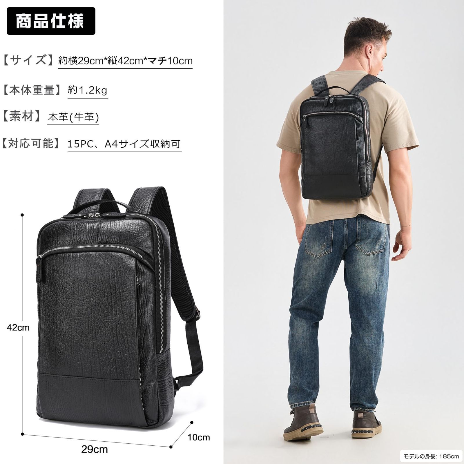 【15インチPC対応可・薄マチのリュック】:本革リュックの本体は500mlペットボトル、折畳傘、スマホ、充電器、手帳、財布、12.5インチiPadだけでなく、A4書類やファイル、雑誌、15インチまでPCをスッキリ収納可能です。約10cmの薄マチで身体にフィットしやすく、大容量で通勤通学はもちろん、1泊2日程度の出張、旅行にも対応可。更に、多彩の機能性ポケットが装備しているので、お荷物を整理整頓できます!