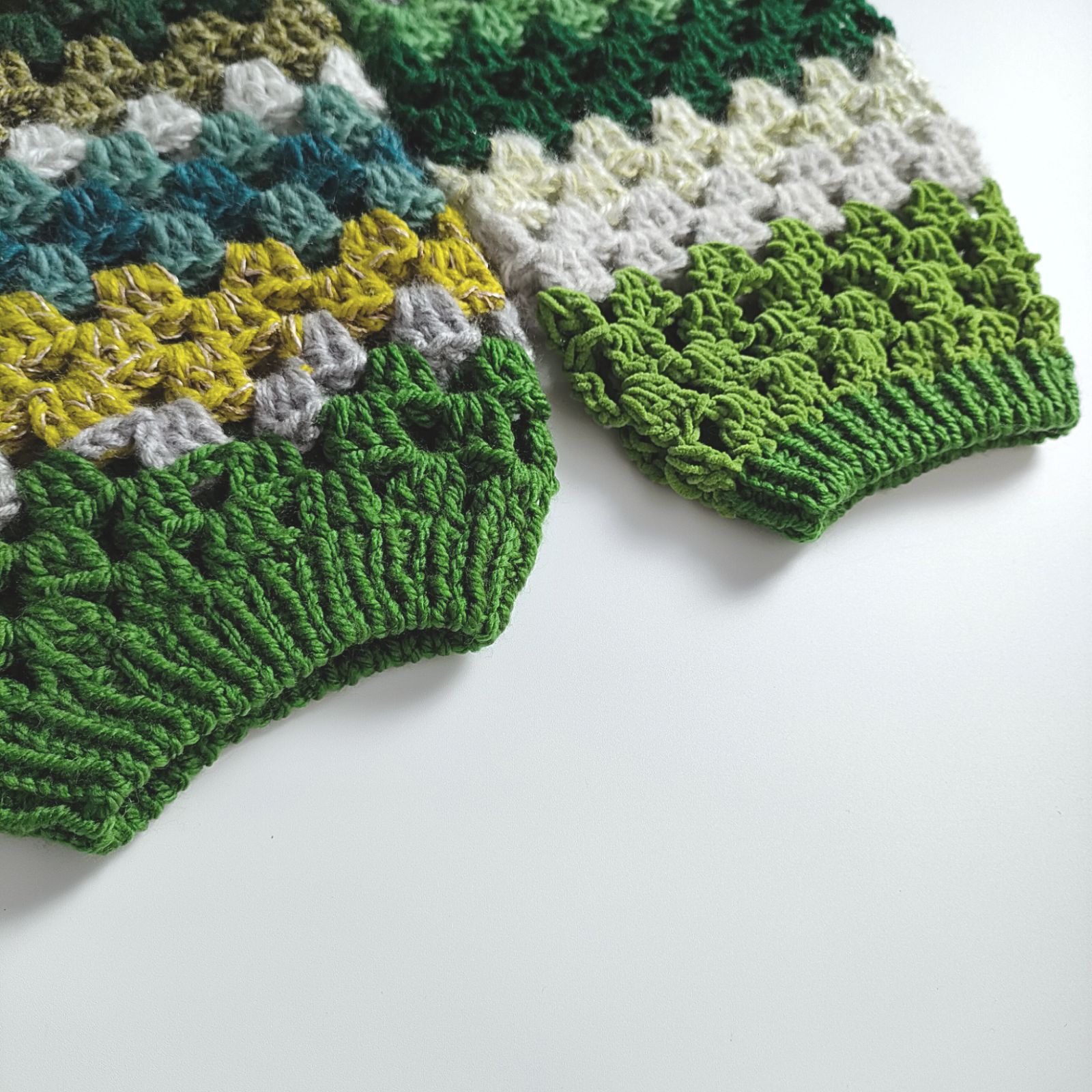編み物 手編み かぎ針編み 毛糸 クロシェ グラニーモチーフ 新品ミックス 秋 冬 緑 黄緑 グレー トップス ロングスリーブ マルチカラー ミックスカラー